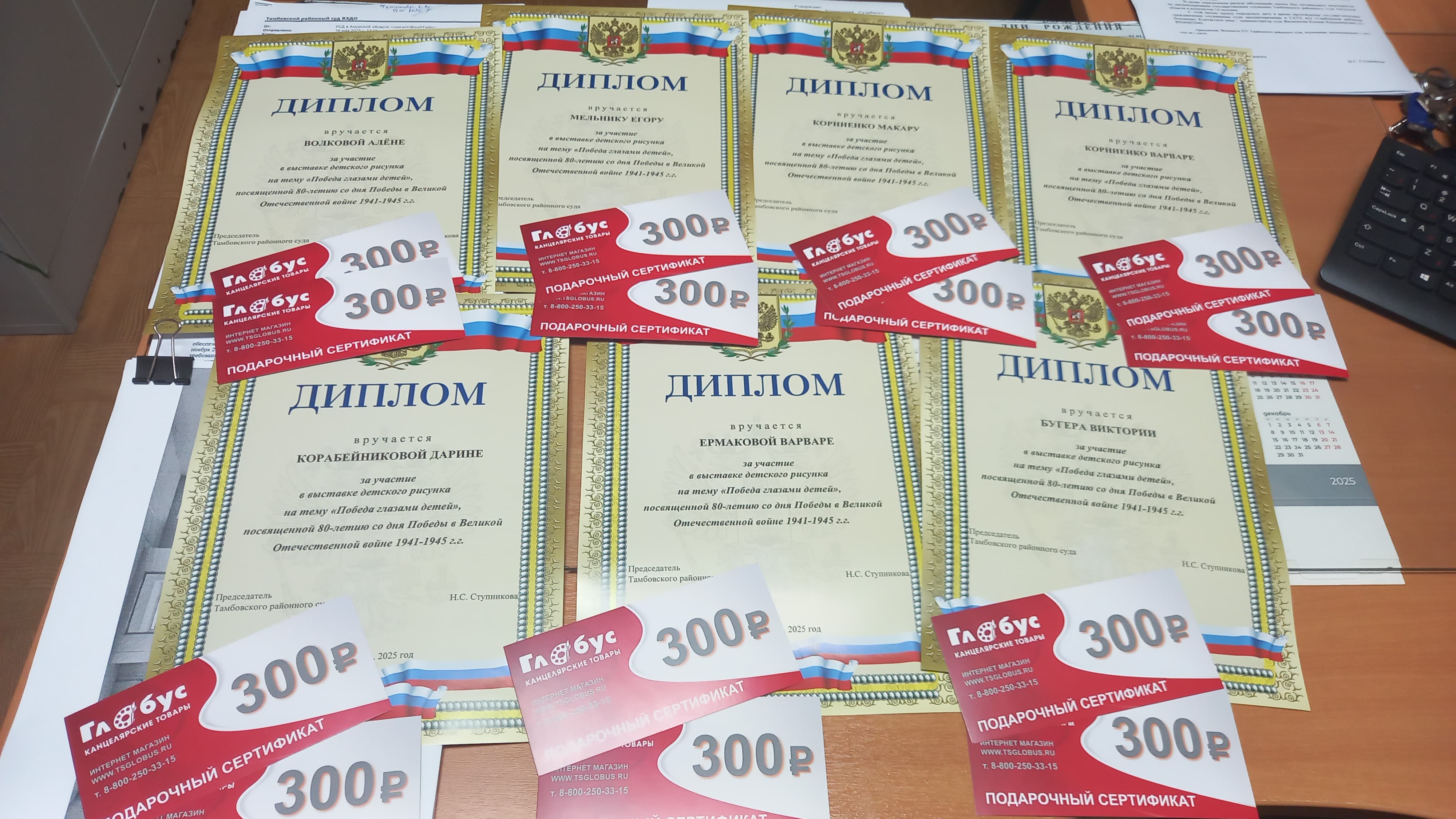 02 июня 2025 года в Тамбовском районном суде состоялось награждение детей, принявших участие в выставке детских рисунков, посвященной 80-летию Победы в Великой Отечественной войне. В творческом состязании приняли участие 7 детей сотрудников суда в возрасте от 3 до 13 лет. Выставка стала прекрасной возможностью для патриотического воспитания и обсуждения значимости Победы для молодого поколения. Председатель Тамбовского районного суда Ступникова Н.С. лично поблагодарила юных художников за участие и вручила им дипломы и подарочные сертификаты. После официальной части мероприятия для ребят было организовано праздничное чаепитие. Все участники получили не только грамоты, но и яркие эмоции.